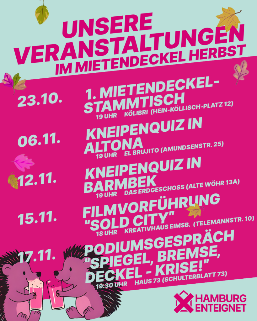 Wir haben für euch eine ganze Reihe toller Veranstaltungen zum Thema Bundesweiter Mietendeckel. Ob Kneipenquiz, Stammtisch oder unser großes Podiumsgespräch mit tollen Expert*innen:
